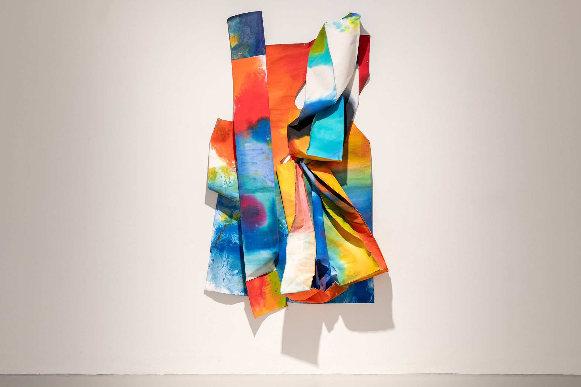 Sewing Fields highlights Gilliam’s connection to Ireland, where a transformative residency at the Ballinglen Arts Foundation in the 1990s reshaped his artistic practice. Gilliam embraced new materials, working with pre-stained fabrics that he had shipped to Ireland, cutting and layering them into sculptural compositions. A collaboration with a local dressmaker further expanded this process, reinforcing his innovative fusion of painting and textile techniques.